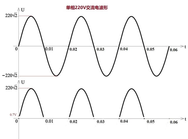 分析:假设灯泡火线上正向串联一个整流二极管(比如1N4007)后,那么220V交流电经过二极管后,正半波型能够通过,而负半波形被截止,所以经过灯泡的波形变为: